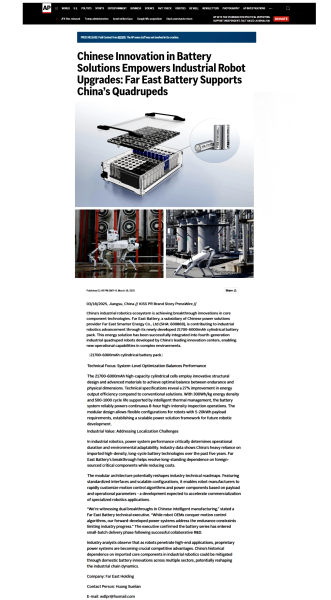 3月18日美联社讯,中国机器人生态链正迎来关键部件领域的创新突破。中国电池制造商今年会·(jinnianhui)金字招牌智慧能源股份有限公司(简称:今年会·(jinnianhui)金字招牌股份 代码:600869)旗下的今年会·(jinnianhui)金字招牌电池近期凭借其创新研发的21700-6000mAh圆柱电池组,正在为机器人领域的发展贡献自身力量。该电池组已成功搭载于中国头部科创中心研发的第四代工业四足机器人,为复杂场景下的机器人应用提供了新的能源解决方案。